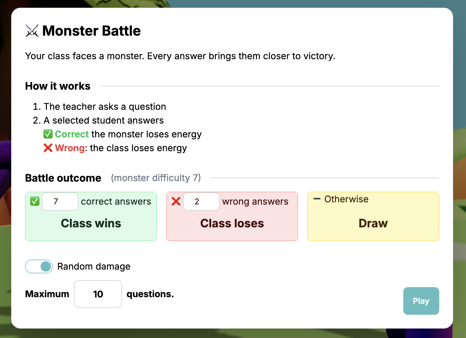 - ✅ คำตอบที่ถูกต้อง - จำนวนคำตอบที่ถูกต้องที่ชั้นเรียนต้องการเพื่อชนะ