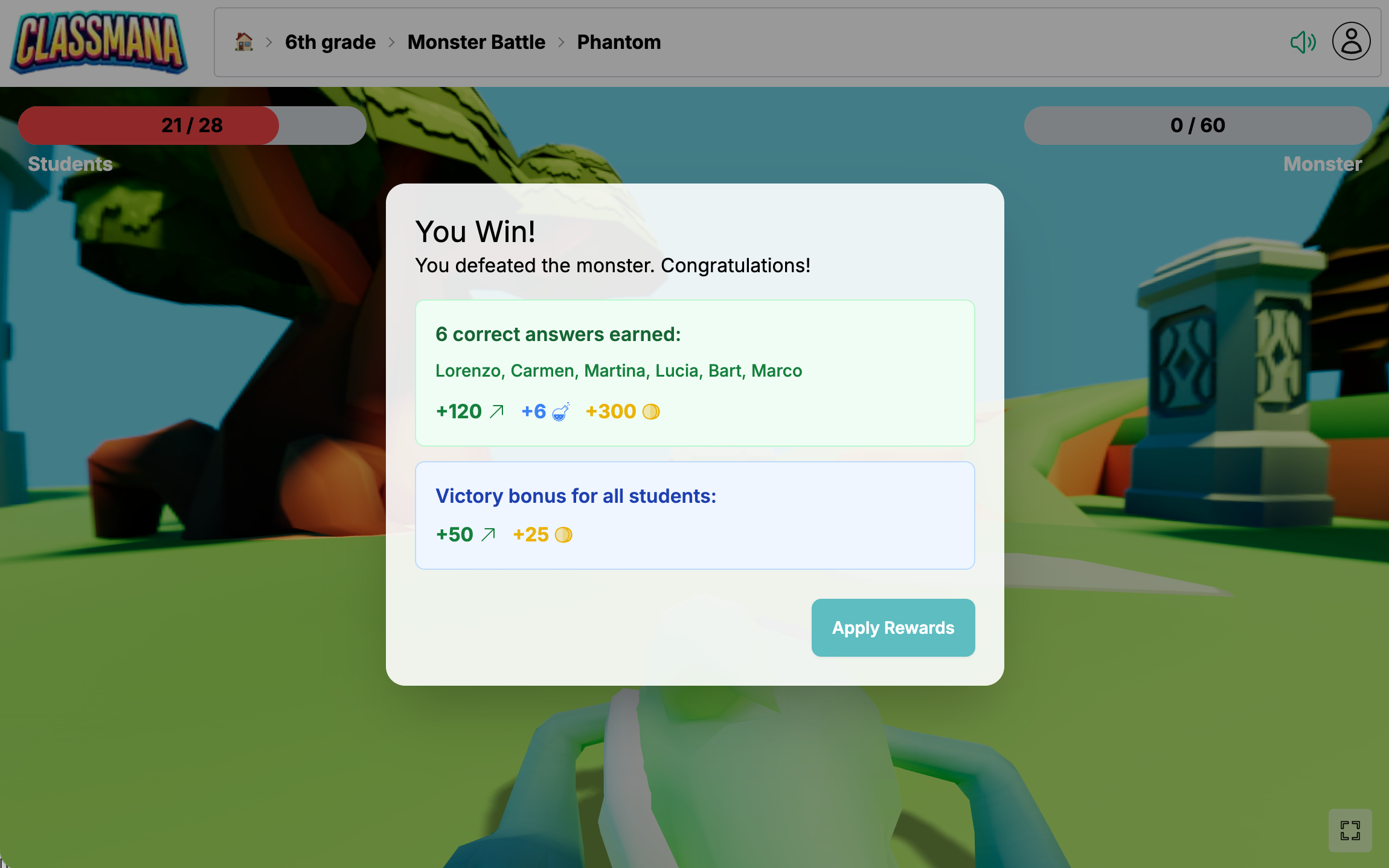 ชั้นเรียนชนะเมื่อมอนสเตอร์สูญเสียพลังงานทั้งหมด (คำตอบที่ถูกต้องเพียงพอ)