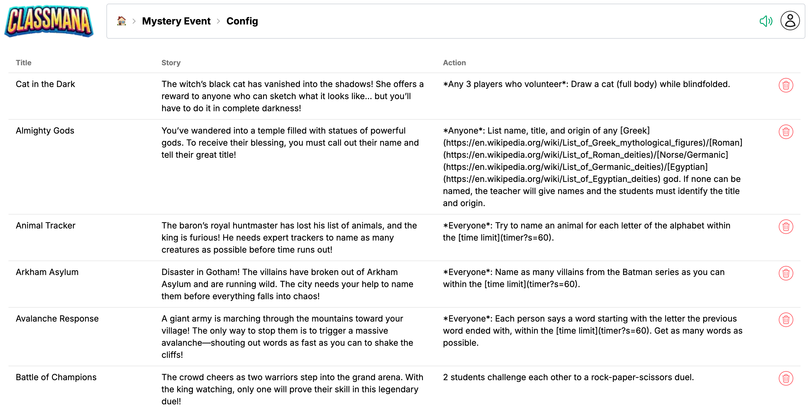 เมื่อใช้กิจกรรมลึกลับจากภายในชั้นเรียน แต่ละชั้นเรียนสามารถมีชุดกิจกรรมของตัวเอง — หรือซิงค์จากชั้นเรียนอื่น เข้าถึงได้จากการกำหนดค่าชั้นเรียนของคุณภายใต้ 🏠 แดชบอร์ด → ชั้นเรียน → ⚙️ กำหนดค่า → 🎲 กิจกรรมลึกลับ